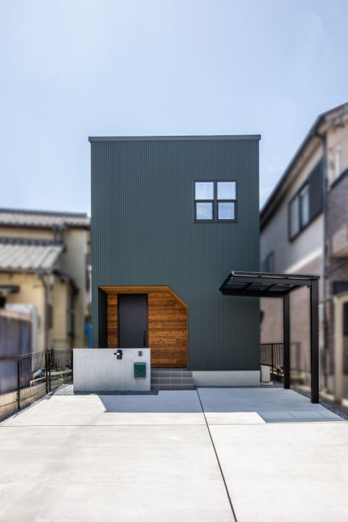 モスグリーンのガルバリウムの奥に覗く板貼りがおしゃれな外観。