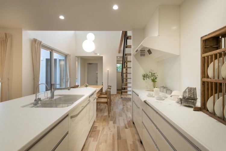 白いオープンキッチン。オープンにすることで、空間の広がりを感じます。
