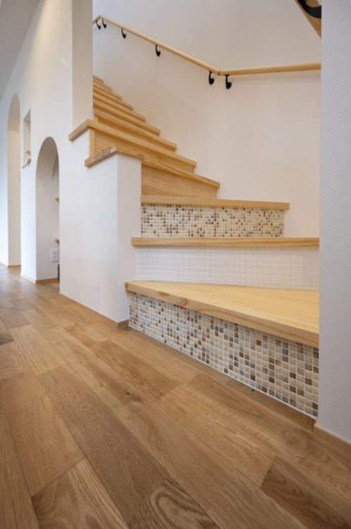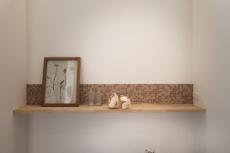 水廻りではなく、玄関横の飾り棚のちょっとしたアクセントとしてモザイクタイルを貼りました。