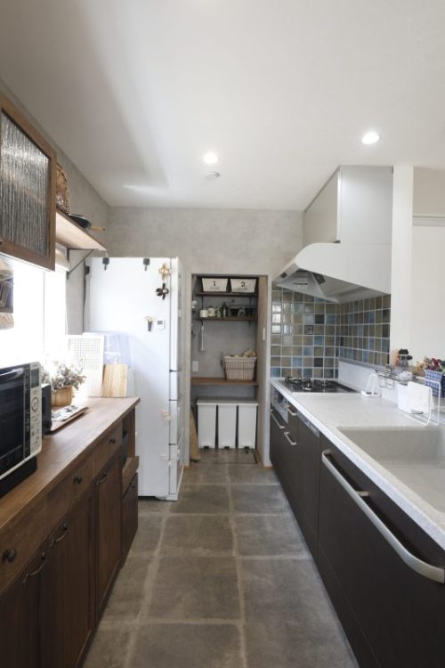 コンロ前に奥様が一目ぼれされたお気に入りのタイルをあしらいました。