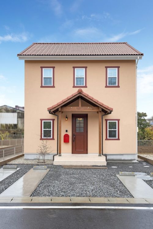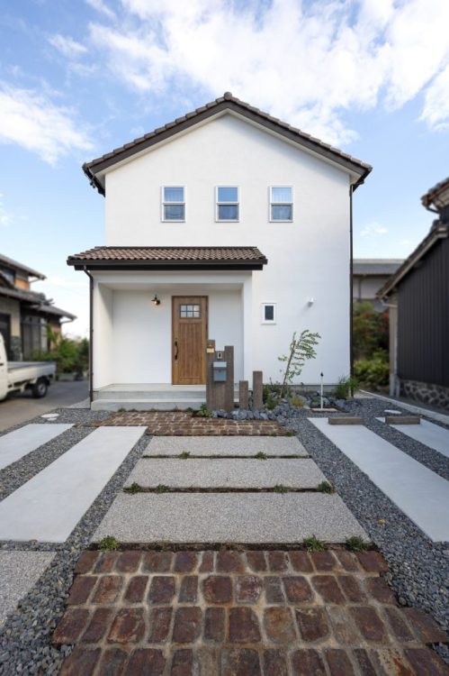白い塗り壁に赤茶色の欧風瓦屋根が素朴で可愛らしい印象のお家です。