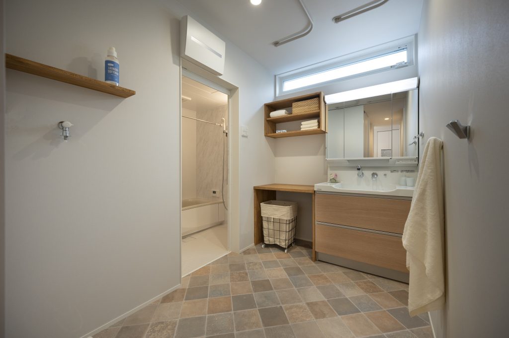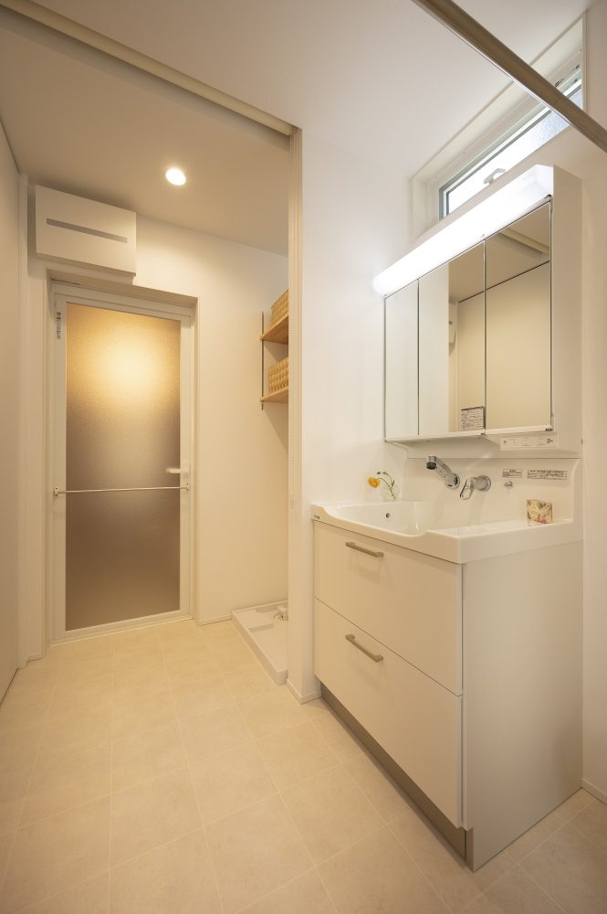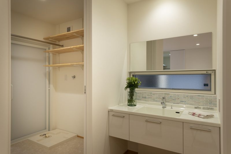 洗面所と脱衣所が隣あわせでありつつも、引き戸で仕切ることができるようになっています。脱衣所には洗濯してすぐに部屋干しもできるちょっとしたランドリースペースになっており、家族みんながプライバシーを保ちつつも暮らしやすい空間になっています。
