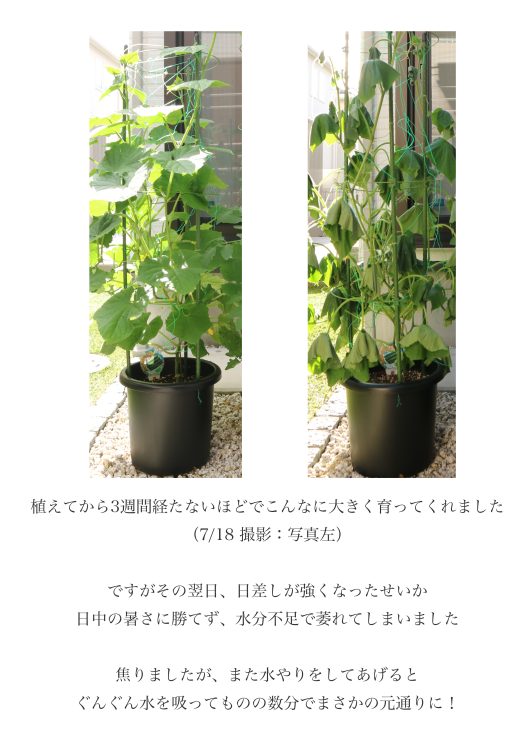 朝と夕方一日2回の水やりをしていますが、日照りが強くなったせいかお昼間に葉っぱが全部しおれて、もうお終いか!?と焦ったり、旅行に行く際の水やりはどうしよう?!と困ったり…。