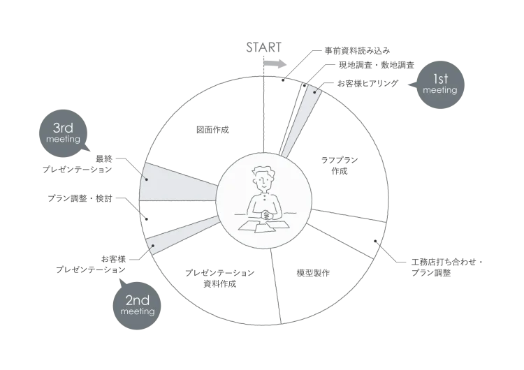 私たち、夢工房キッチンくらぶで家づくりをした際、建築家との打ち合わせは基本3回。少ない回数に思えるかもしれませんが、私たち地元の工務店と、土地を読み、暮らしやすさをと要望を最大限取り入れることができる建築家がしっかり連携していること。そしてあなたとじっくり丁寧なヒアリングと検討を行うことで、ご希望をしっかり反映したプランを効率的に導き出すことができます。