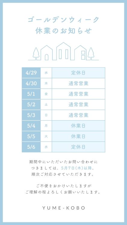 誠に勝手ながら、下記の期間はゴールデンウィークの休業をいただいております。