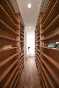 廊下スペースと兼用することで面積を節約しながらとても合理的に本棚を設けることができました。