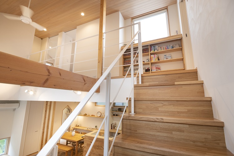 また、大きな吹き抜けがあることで2階の本棚コーナーで本を読む旦那と吹抜け越しで会話ができます。
