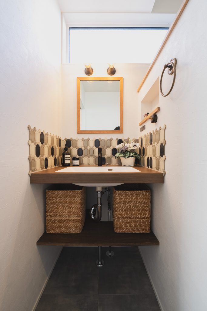 お家の雰囲気を形にしていくにあたり、僕たちからは作りたいイメージの写真をたくさん用意していきました。例えば1階に作った洗面タイルも、写真を見せながら「こんな風にしたい」って。タイルはたくさんの種類があるので、組み合わせも見ながら「これだね」と話し合いながら決めていきました。