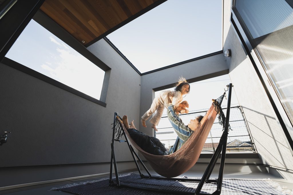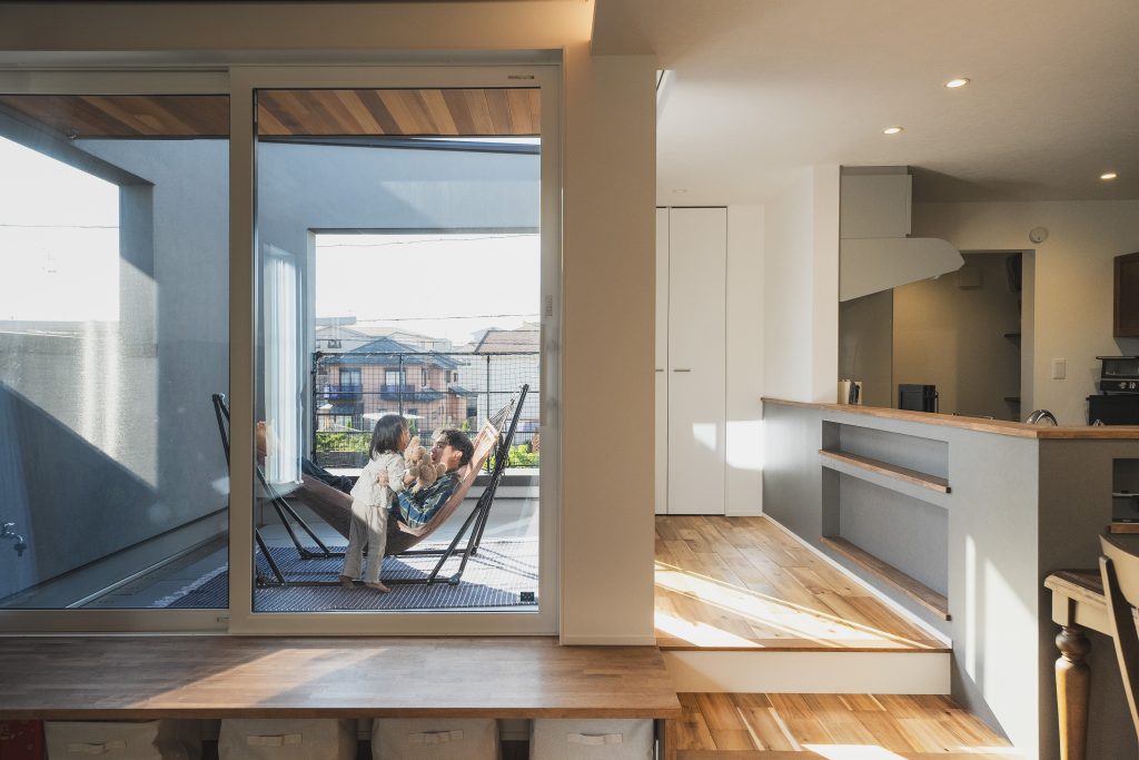 旦那様:ベランダとリビングの間のベンチです。ベンチでは寝転んだり、子どものおもちゃを収納することもできます。あとは、こだわったバルコニー。本当に周りからの視線を感じないですね。ハンモックでごろごろしていると気持ちが良くて、すごく気に入っています。