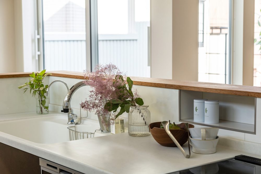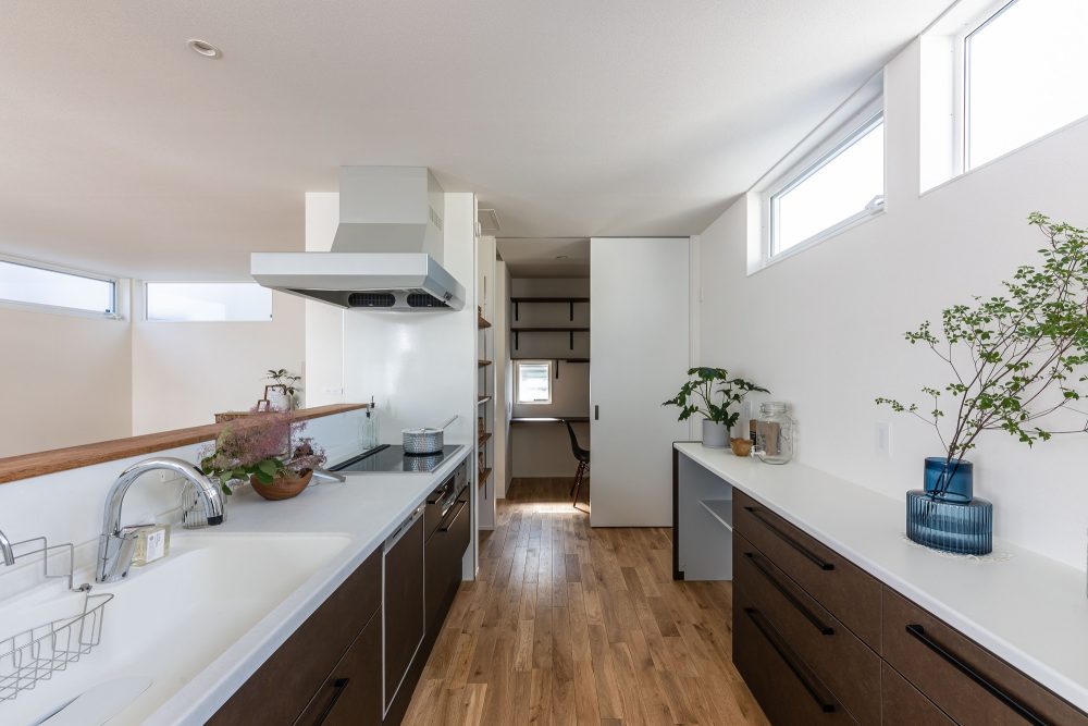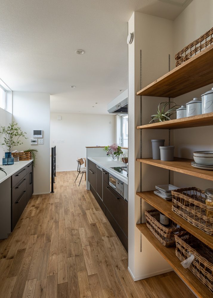 キッチンはパントリーと冷蔵庫を見えにくい位置におき、生活感を軽減しました。