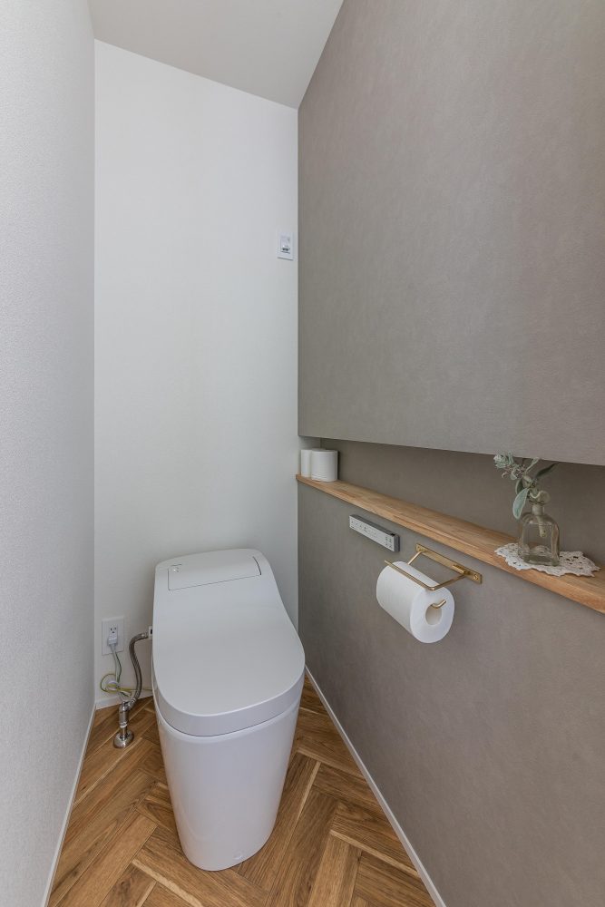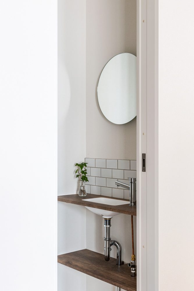 洗面台はモルタル調の天板に見せない収納でシンプルに。