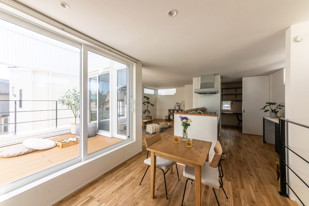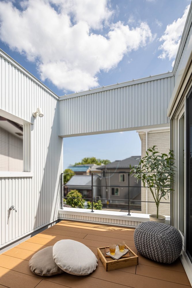 2階リビングにはバルコニーを併設し、アウトドアリビングを楽しみます。