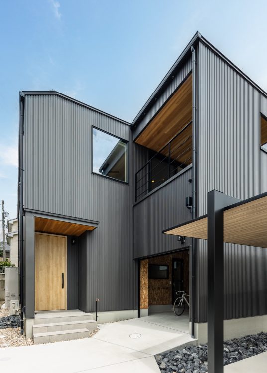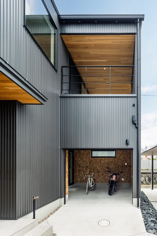 いぶし銀のガルバリムの外観。夢だったバイクガレージを設置しました