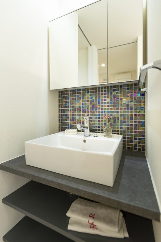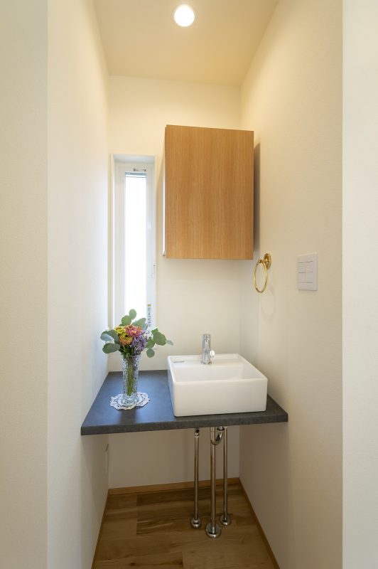 明り取りに設けた窓のおかげで閉塞感がない手洗いです