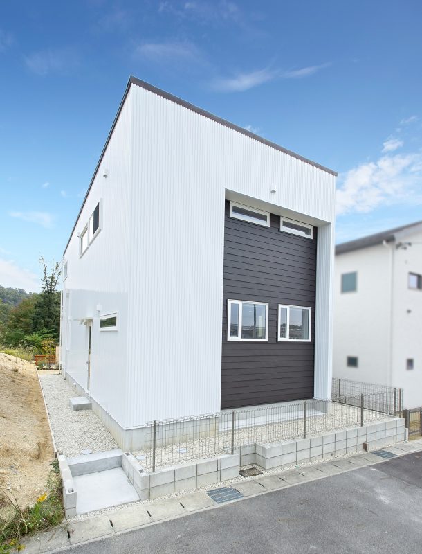 白でまとめたシンプルな外観と木でできた囲いがかわいい外構のお家です