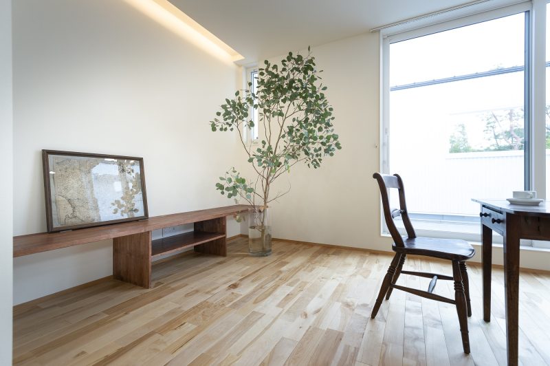 造作の棚は暗めの色味にし、お部屋を引き締めます