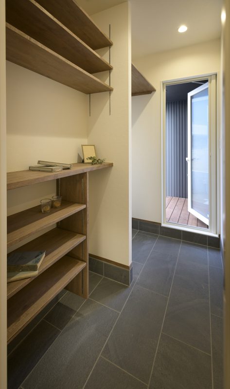 ご主人こだわりの玄関タイルはかっこいい石目調。