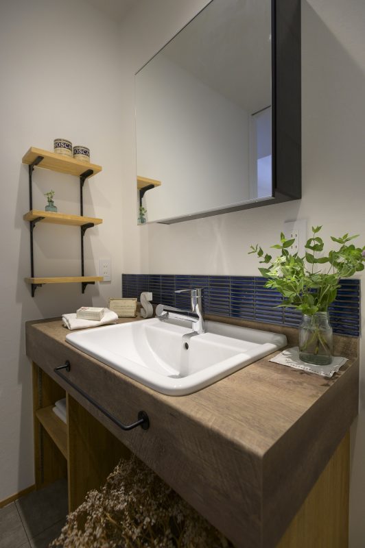 ブルーのタイルが清涼感のある、造作の洗面台