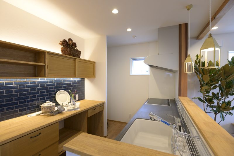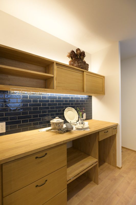 青いタイルと間接照明が映えるキッチンキャビネット