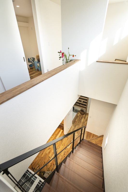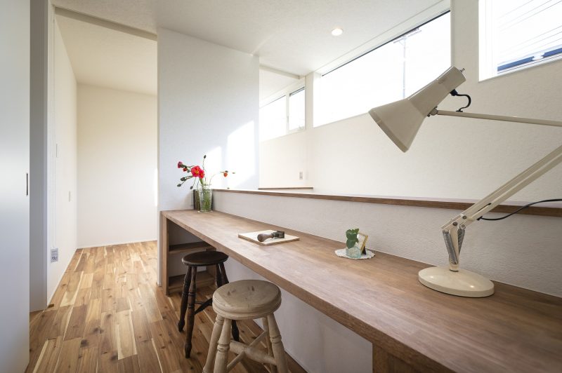 吹き抜けに面したところに造作カウンターを設けて、通路の有効利用かつ開放的になっています