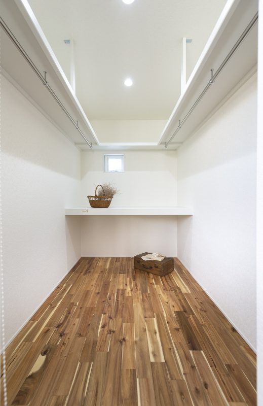 ウォークインクローゼット。小さな小窓からの光で閉塞感を感じません
