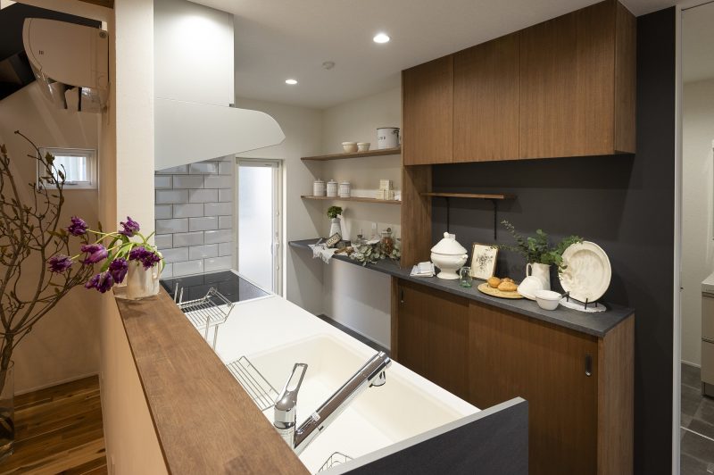 暗めな木と黒でシックに仕上げたキッチンキャビネット
