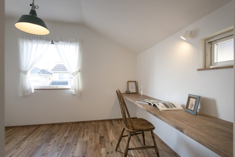 勾配天井の子ども部屋。将来仕切りを設けられる仕様です。