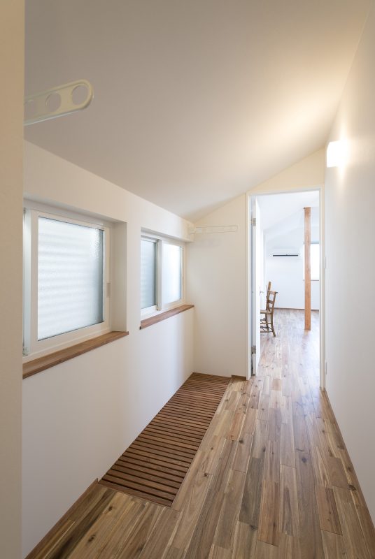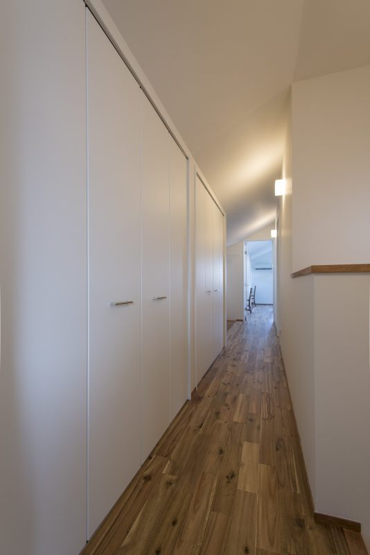 2階も仕切りを設けない真っすぐな廊下で、坪数以上の広がりを感じます。