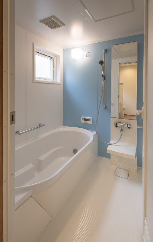かわいい水色の壁のお風呂。