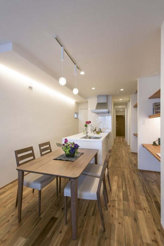 キッチンとダイニングは横並びにすることで、家事動線のいい間取りに。