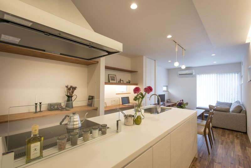 白いオープンキッチン。壁を設けないことで、空間にゆとりが生まれます。