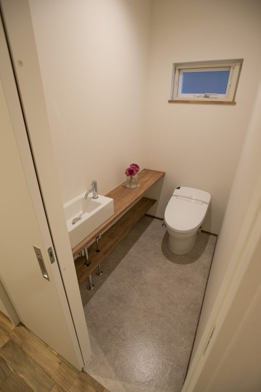 タンクレスのトイレ。コンパクトな手洗いに合わせて棚を作りました。