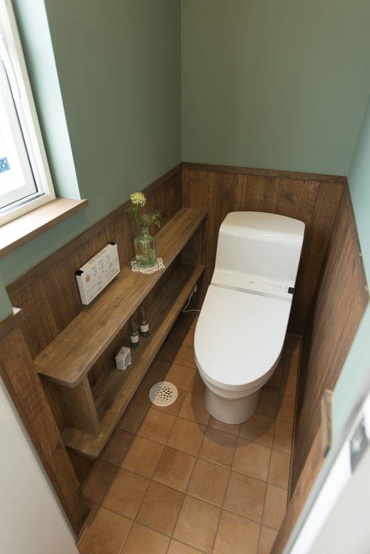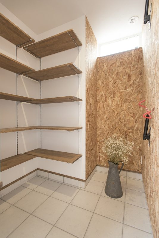 腰壁に板貼りを。実用的な造作の収納もポイントです。