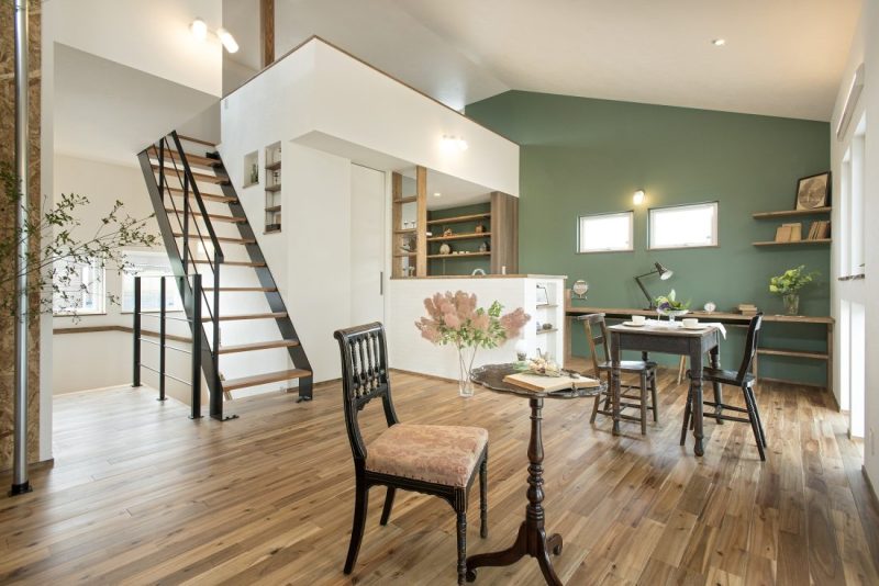 モスグリーンの壁紙がおしゃれなLDK。階段やロフトがあることで、抜け感や空間の広がりを感じます。