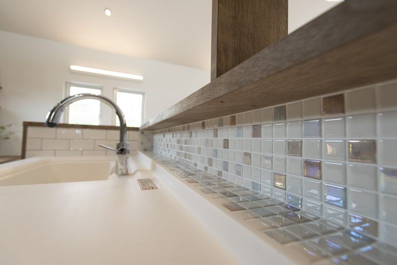 キッチンの前にはニッチを設け、調味料などを収納できるように。かわいいタイルで料理する時の気分も上がります。