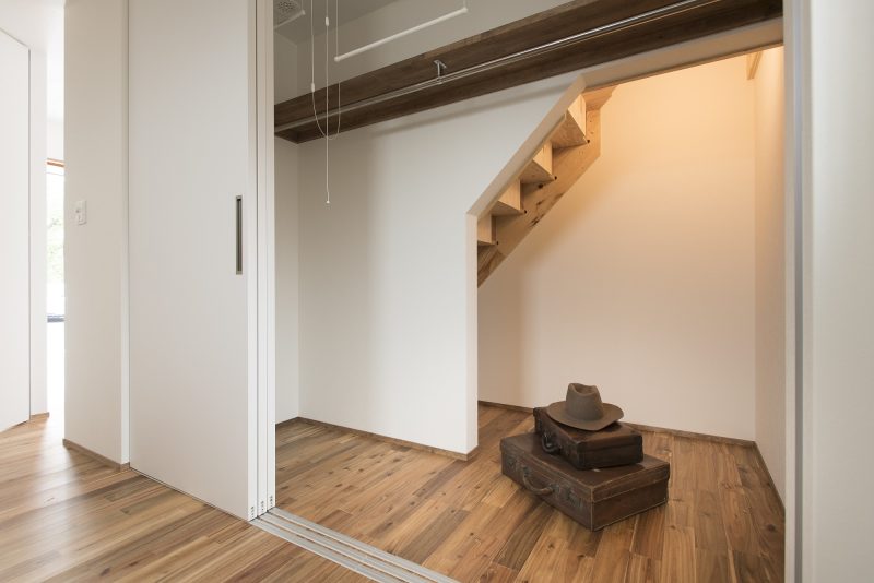 階段下を収納にすることで、空間を有効活用します。