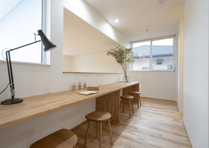2階の廊下は長いカウンターを設けて勉強スペースに